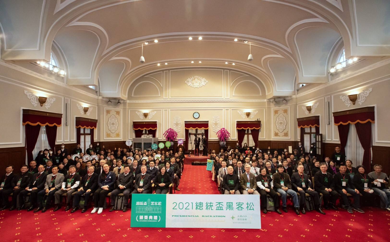 「2021總統盃黑客松」頒獎典禮今(26)日於總統府辦理,由蔡英文總統親自頒發卓越團隊獎座,肯定國內松與國際松共7組獲獎團隊協力共創,展現黑客精神。