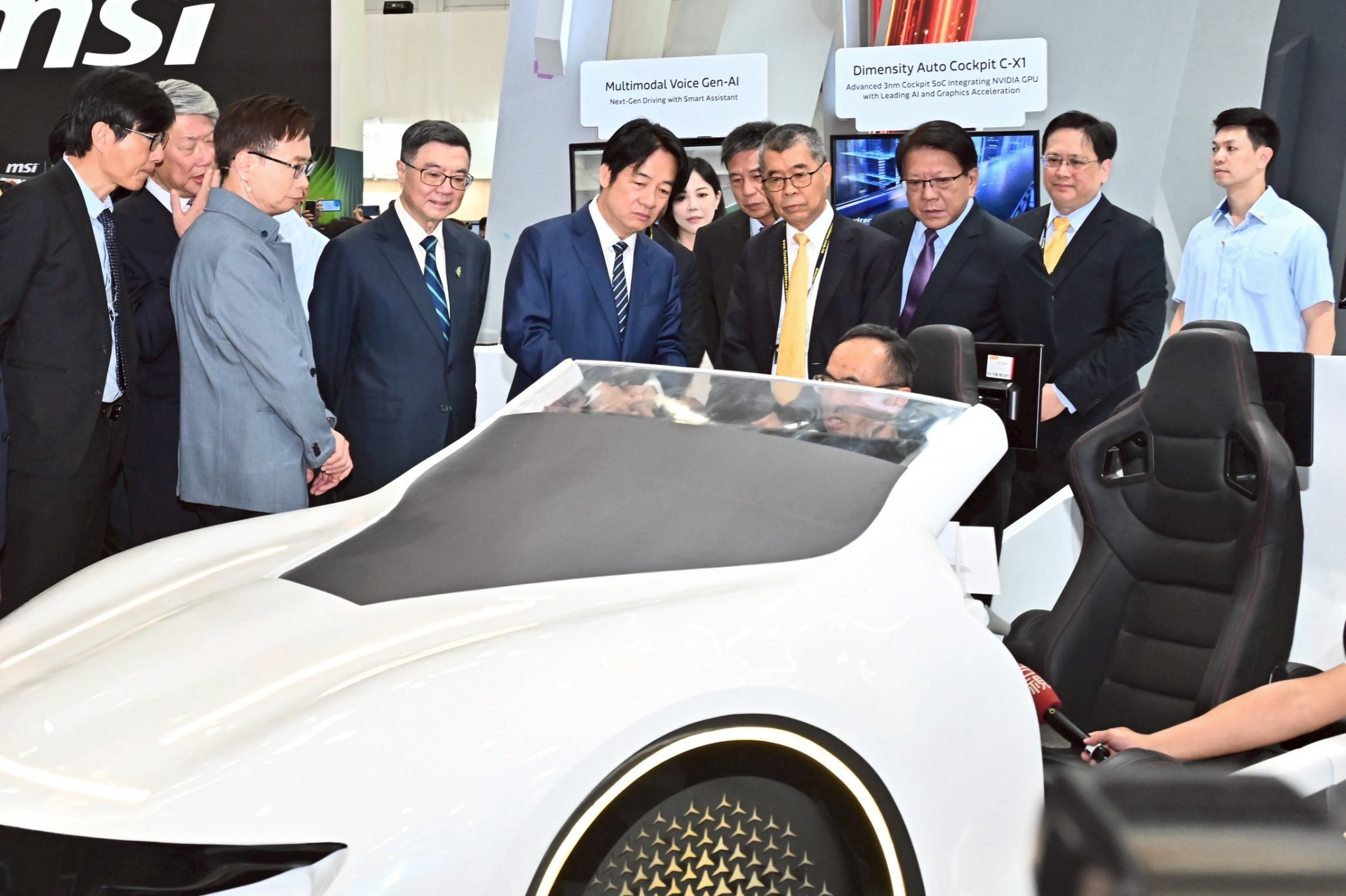 接續,卓院長陪同總統參觀「趨勢科技(Trend Micro)」、「明基(BenQ)」、「宏碁(Acer)」、「華碩(ASUS)」、「微星(MSI)」、「聯發科技(MediaTek)」、「台達電(DELTA)」、「和碩(Pegatron)」與「鴻海(Foxconn)」等臺灣指標企業展位,並聽取業者代表說明亮點技術與研發布局。華碩施崇棠董事長現場也展示具超算能力的AI POD伺服器,並細數華碩積極參與「臺灣杉二號」、「晶創計畫」等國家AI算力基礎建設,以及支援繁體中文的「福爾摩沙大型語言模型」;鴻海科技集團由劉揚偉董事長介紹集團最新採用輝達(NVIDIA)新一代晶片核心技術的伺服器架構;和碩童子賢董事長則展示全液冷AI伺服器平臺及機械犬產品。