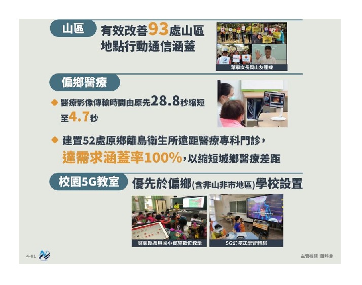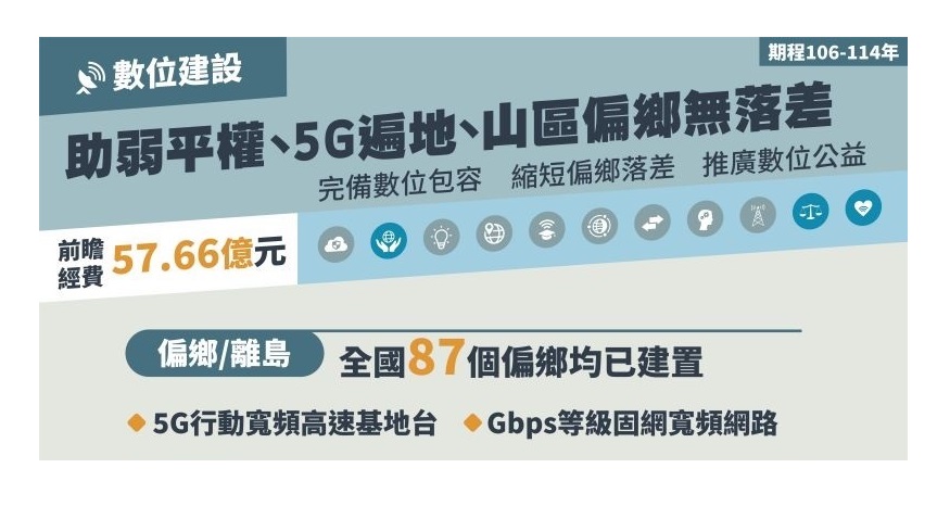 因應數位經濟及疫後時代之到來,有必要在寬頻網路建設加強投資,一方面確保產業發展之需求,一方面確保民眾的生活品質,因此特別著重城鄉網路落差的縫合。自110年起推動第二階段前瞻計畫,針對5G、人工智慧(AI)、資安等數位科技,擘劃11大主軸、52項重點項目,並推動多元面向之「助弱平權、5G遍地、山區偏鄉無落差」、「基礎通訊整備」、「企業賦能」、「民眾安居好生活」等成果,打造偏鄉資訊無落差的環境。完整介紹請見「前瞻基礎建設計畫施政亮點資訊網」(https://fi.ndc.gov.tw)。