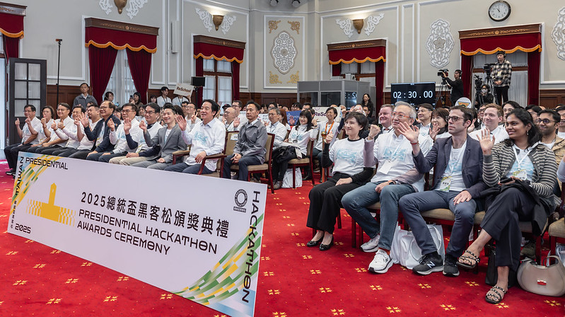 總統致詞時,首先歡迎大家來到總統府共同見證及分享「2025總統盃黑客松」的成果與榮耀,看到來自四面八方、各個不同領域的團隊,秉持「開放協作、跨域共創」的精神,運用數據、科技與創新思維解決各項公共問題,令人佩服。並提到,今年已邁入第8屆的總統盃黑客松,目前已累積41組國內松、14組國際松獲獎團隊,獲選提案內容相當多元,不只有優化醫療照護、提升社會安全,也涵蓋環境保護及交通改善等議題,許多優秀提案甚至已轉化為具體政策,融入在日常生活當中,推動臺灣不斷向前。