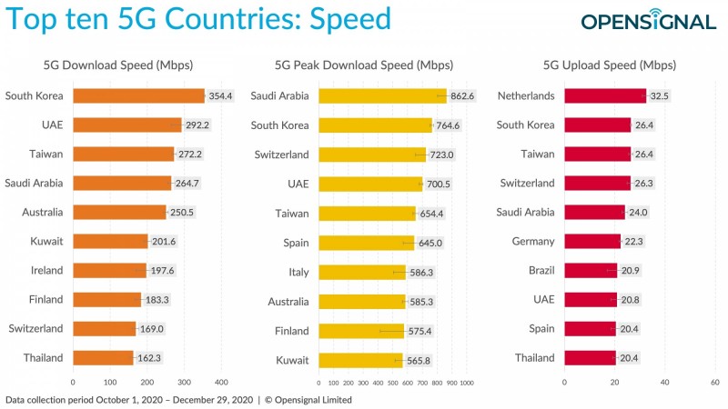Opensignal資料收集期間為去年10月1日至12月29日,台灣「5G下載網速」以平均272.2Mbps,全球第3。