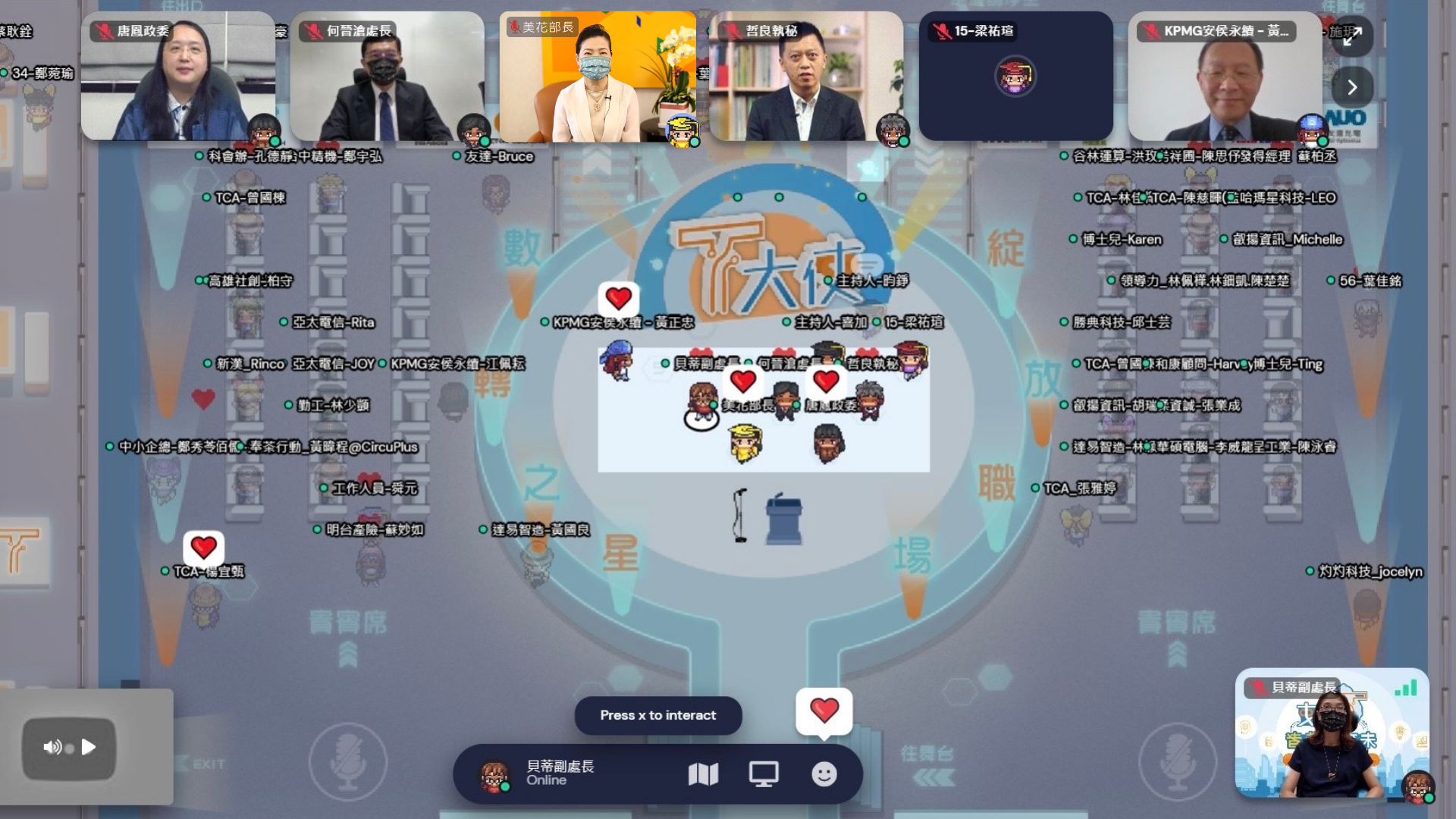 經濟部中小企業處於今(9/4)日辦理第一屆T大使畢業典禮暨數位之星頒獎,有別於一般線上活動,運用時下最夯、受青年喜愛的Gather Town會議軟體進行,與會貴賓與青年化身Q版2D RPG角色線上群聚,為典禮增添溫度與數位感。行政院唐鳳政委、經濟部王美花部長、行政院科技會報辦公室葉哲良執行秘書、經濟部中小企業處何晉滄處長、胡貝蒂副處長等數位轉型重要推手聯袂出席,透過軟體特效,觸發「數轉之星‧綻放職場」造型煙火文字,為第一屆396位完訓T大使獻上畢業祝福,同時也勉勵青年投入數位領域展現實力,在職場上大放異彩。