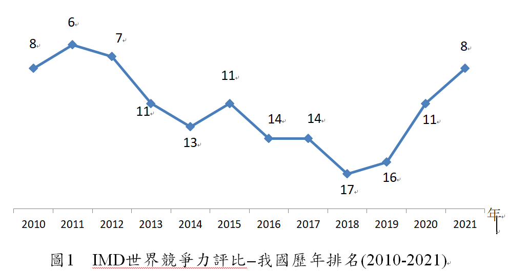 瑞士洛桑管理學院(IMD)今日公布「2021年IMD世界競爭力年報」(IMD World Competitiveness Yearbook)。IMD指出,2021年評比結果顯示,一國得以在疫情衝擊中脫穎而出,創新、數位化、社會福利及凝聚力是關鍵因素。臺灣在64個受評比國家中,排名第8名,為2013年以來最佳表現(詳附表1、圖1)。