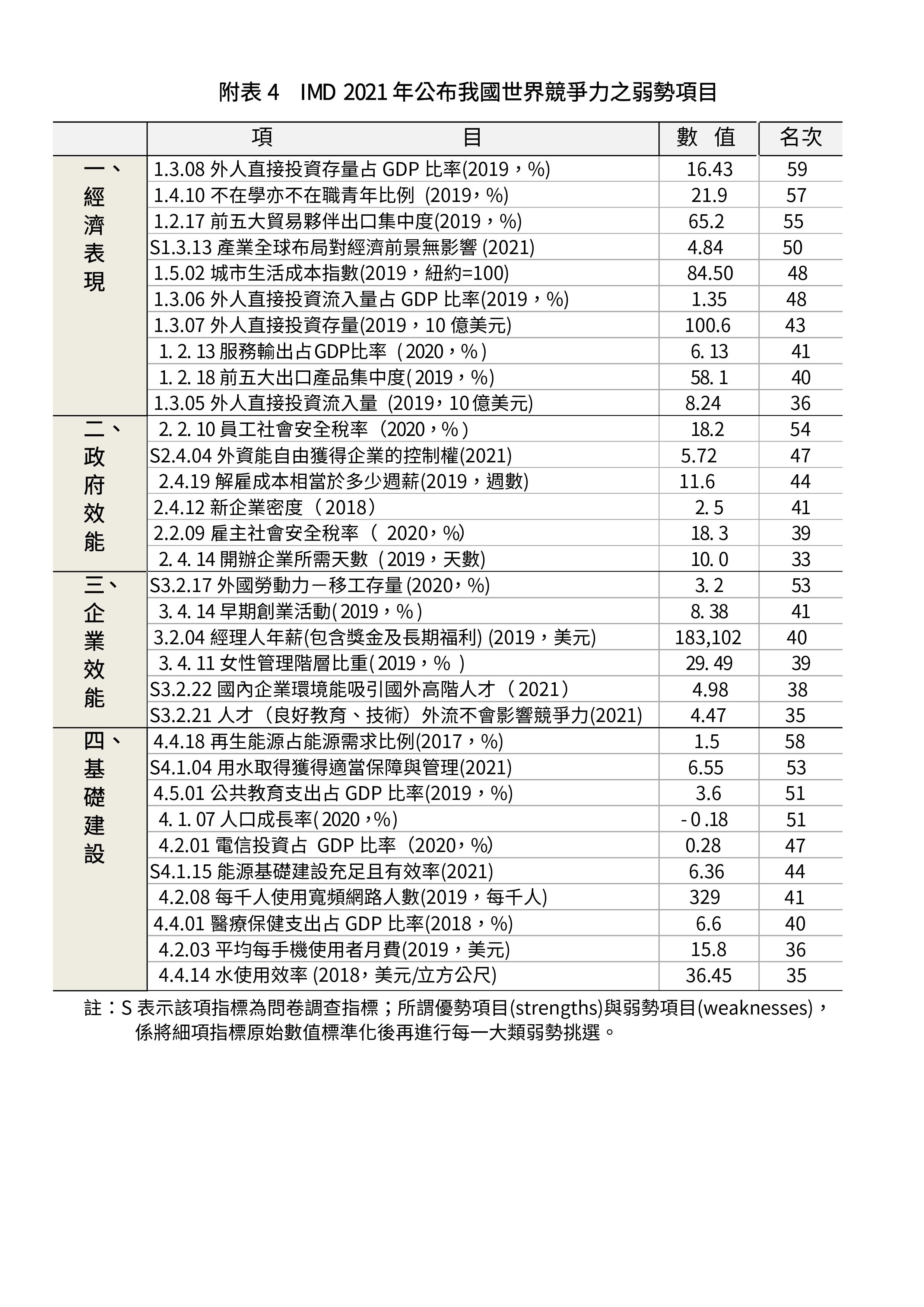 附表4 IMD 2021年公布我國世界競爭力之弱勢項目