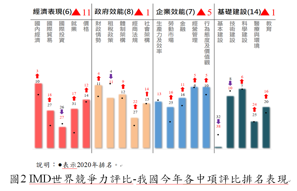 台灣在「經濟表現」、「政府效能」、「企業效能」與「基礎建設」四大類指標排名均較去年進步,其中,「經濟表現」較去年大幅提高11個名次,「企業效能」亦上升5個名次,彰顯臺灣的數位科技實力、企業創新活力與社會凝聚力。20項中項評比項目中,15項較去年進步,其中「國內經濟」(第3名)、「財政情勢」(第4名)、「經營管理」(第5名)與「行為態度及價值觀」(第5名),備受國際肯定(詳圖2)。至於細項評比項目中,臺灣多項評比項目亦名列全球前3名(詳附表2)。