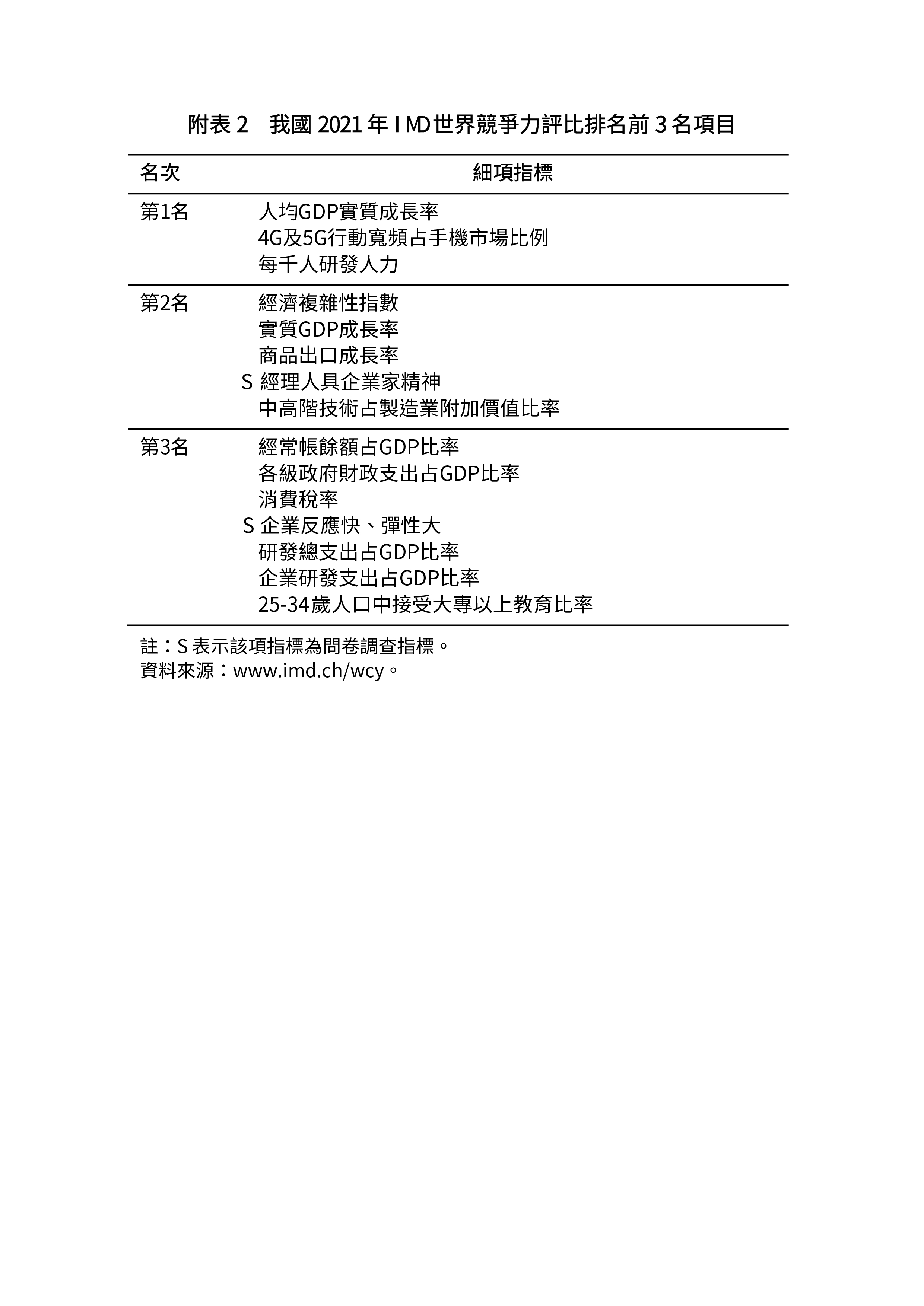附表2 我國2021年IMD世界競爭力評比排名前3名項目