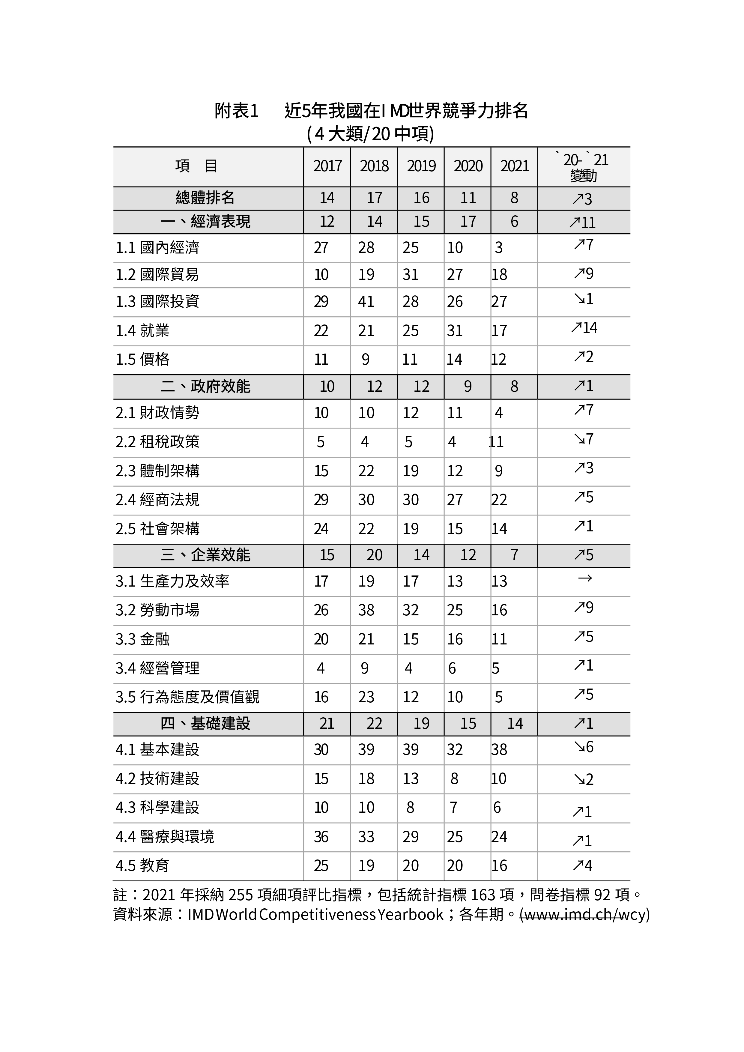 附表1 近5年我國在IMD世界競爭力排名