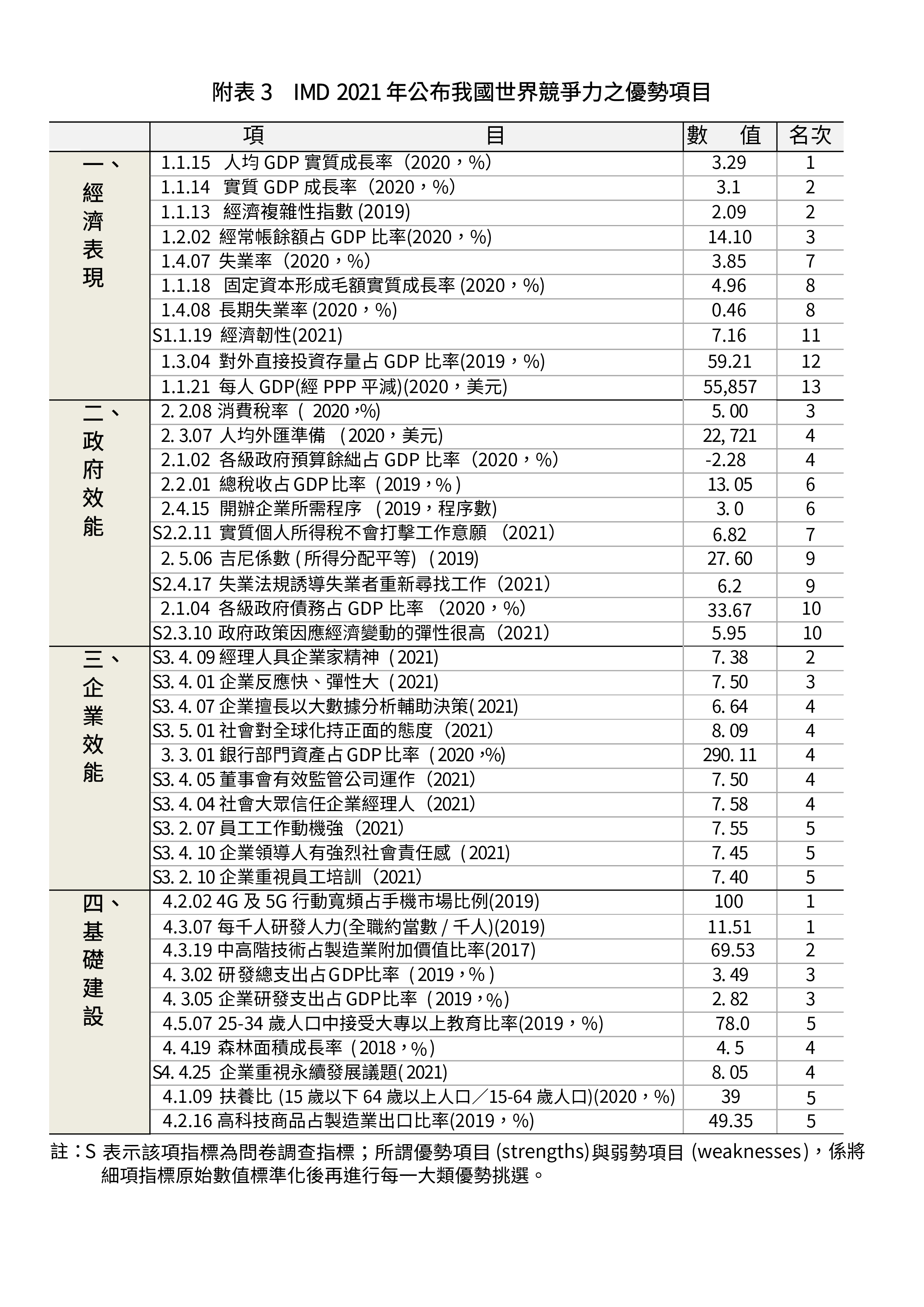 附表3 IMD 2021年公布我國世界競爭力之優勢項目
