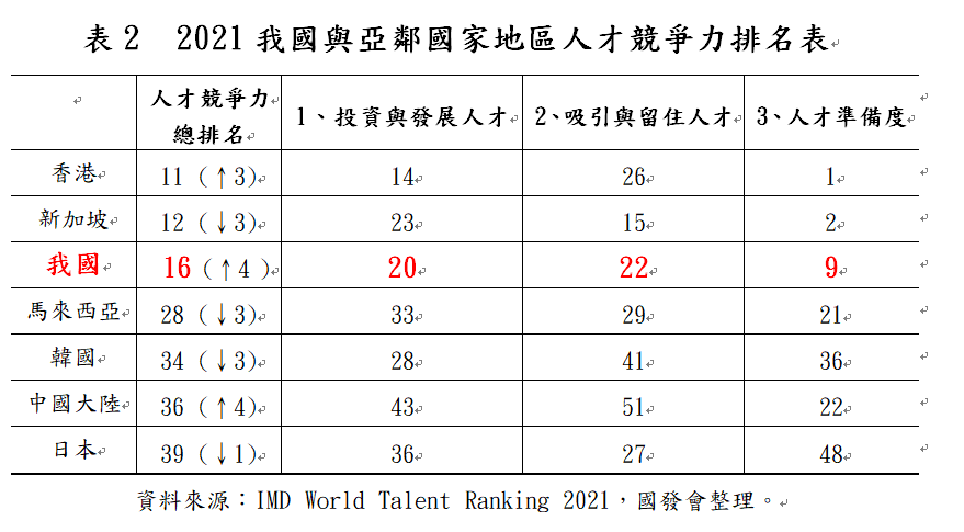 瑞士洛桑管理學院(IMD)本(2021)年12月9日發布「2021年IMD世界人才排名報告」(IMD World Talent Ranking 2021),在64個受評比經濟體,我國排名第16名,較去年進步4名,為近10年以來最佳表現。在亞洲地區,我國排名保持第3名,僅次於香港(第11名)、新加坡(第12名),優於韓國(第34名)、中國大陸(第36名)及日本(第39名)。