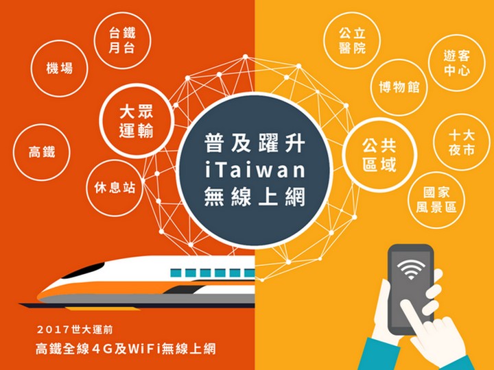行動上網已經成為每個人生活中的重要部分,網路基礎建設及創新應用能力,已成為國家的核心競爭力。行政院推動提升iTaiwan上網速率及增加熱點涵蓋率,期望今年世大運前完成高鐵全線提供WiFi無線上網服務新的里程碑。同時也針對公共區域、大眾運輸、賽事會議等場域,提供臺灣民眾、來台貴賓、海內外選手貼心數位服,以展現台灣的資訊國力。
