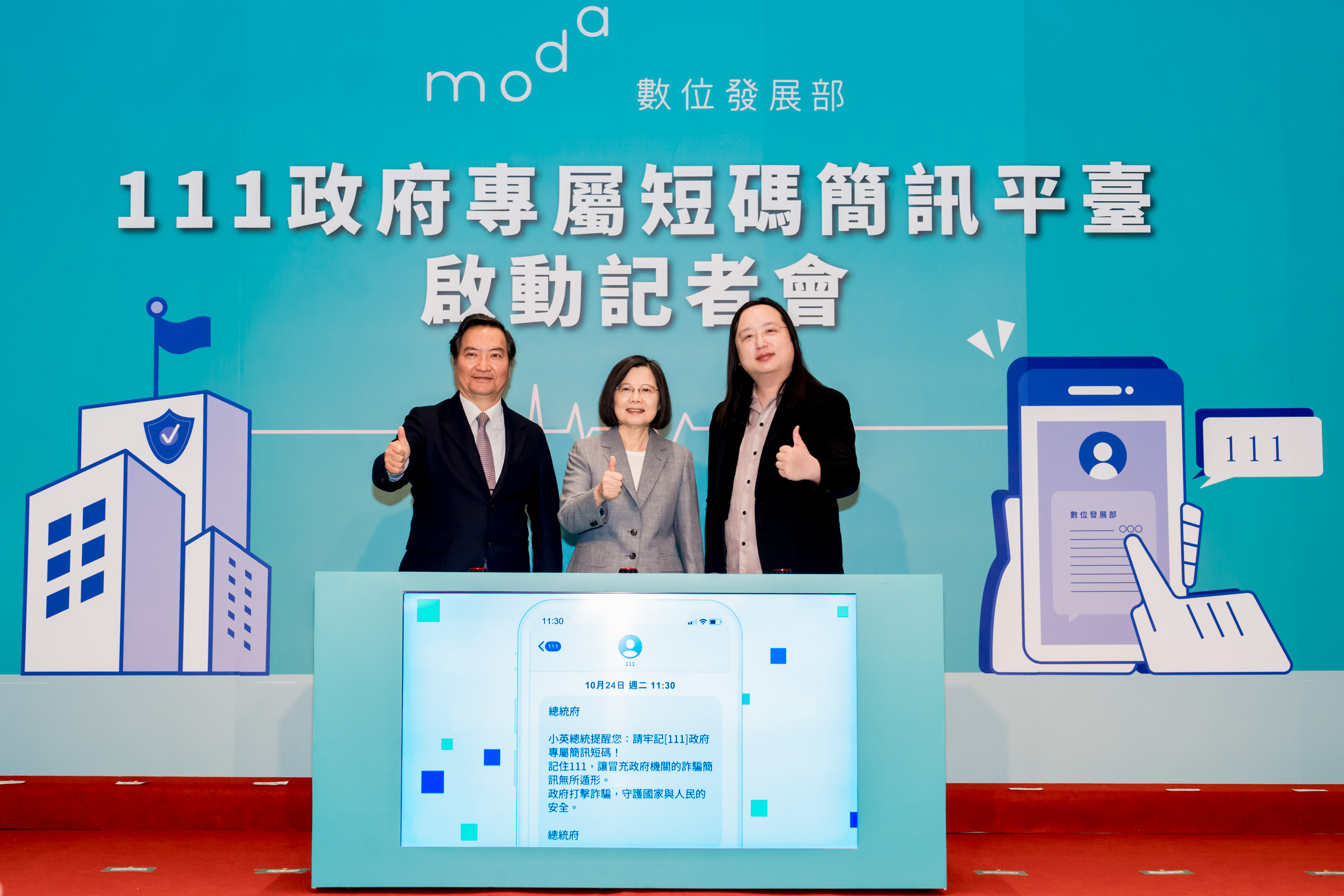 數位發展部今(24)日上午舉行「111政府專屬短碼簡訊平臺啟動記者會」,蔡英文總統親自蒞臨,宣布啟動111簡訊平臺,並在現場示範發送111政府簡訊給參加的媒體朋友,即時展現簡訊發送功能,透過數位部推動數位信任科技的概念,宣示政府從源頭提供可信任的訊息,強化防阻詐騙。數位部唐鳳部長提醒,民眾未來只要認明111短碼,即可確認簡訊內容來自政府機關,避免被詐騙集團偽冒的政府簡訊所騙。