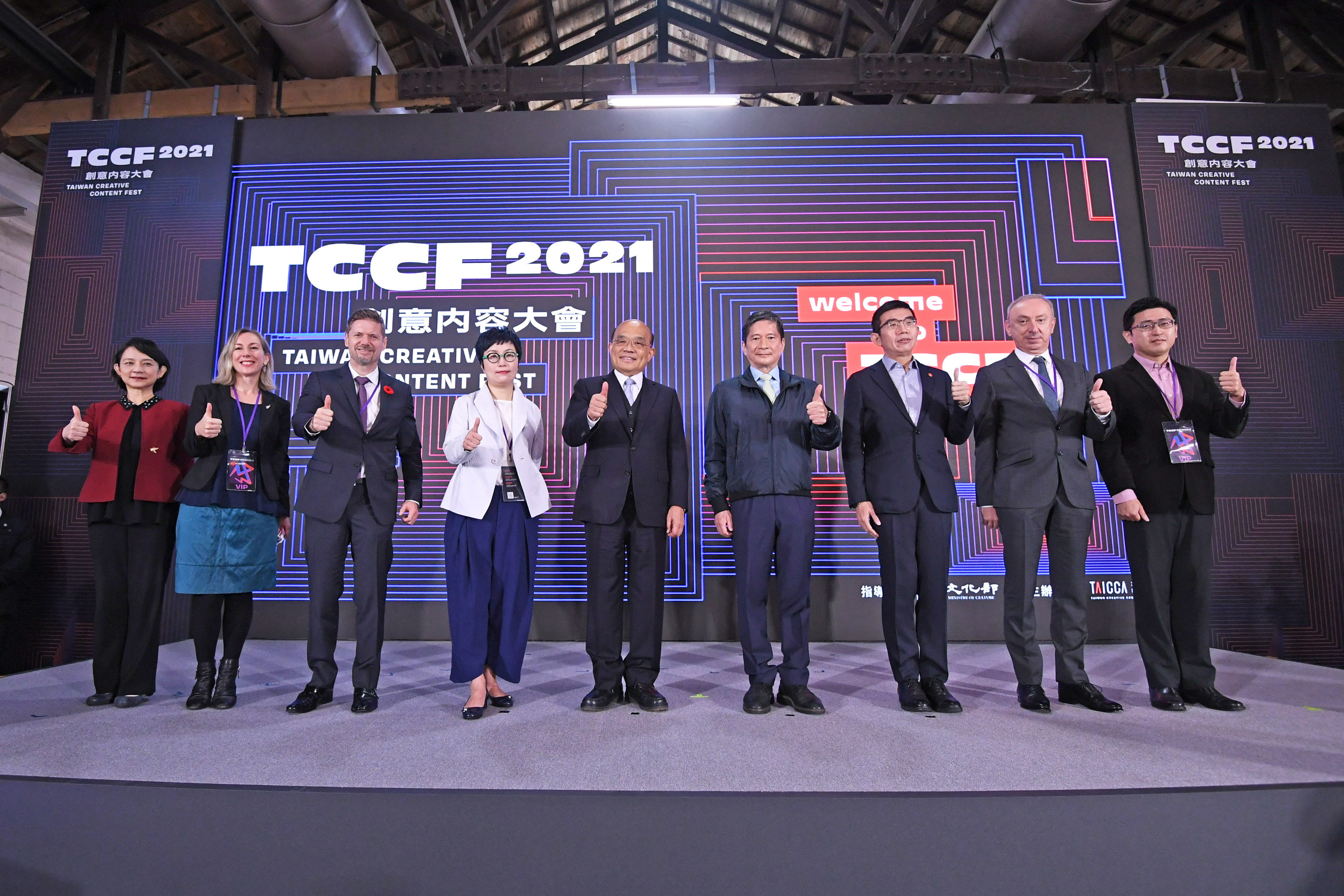 院長致詞結束後,偕同文化部長李永得、文化內容策進院董事長丁曉菁、文化內容策進院院長李明哲於舞臺螢幕前,以手觸碰「TCCF」(Taiwan Creative Content Fest)文字,為本場活動正式揭開序幕,並與參展單位代表合影。隨後,院長也參觀「接下來練習場」展區,主題包括「幸福路上」、「貴金影業」、「看見‧齊柏林基金會」、「泊人(傻塔克)」、「固態記憶(虛擬實境體驗)」、「小島大歌」、「尼可樂表演藝術」等,院長仔細聆聽各主題策展人解說,對展出的創意內容及嶄新互動體驗均表示肯定。