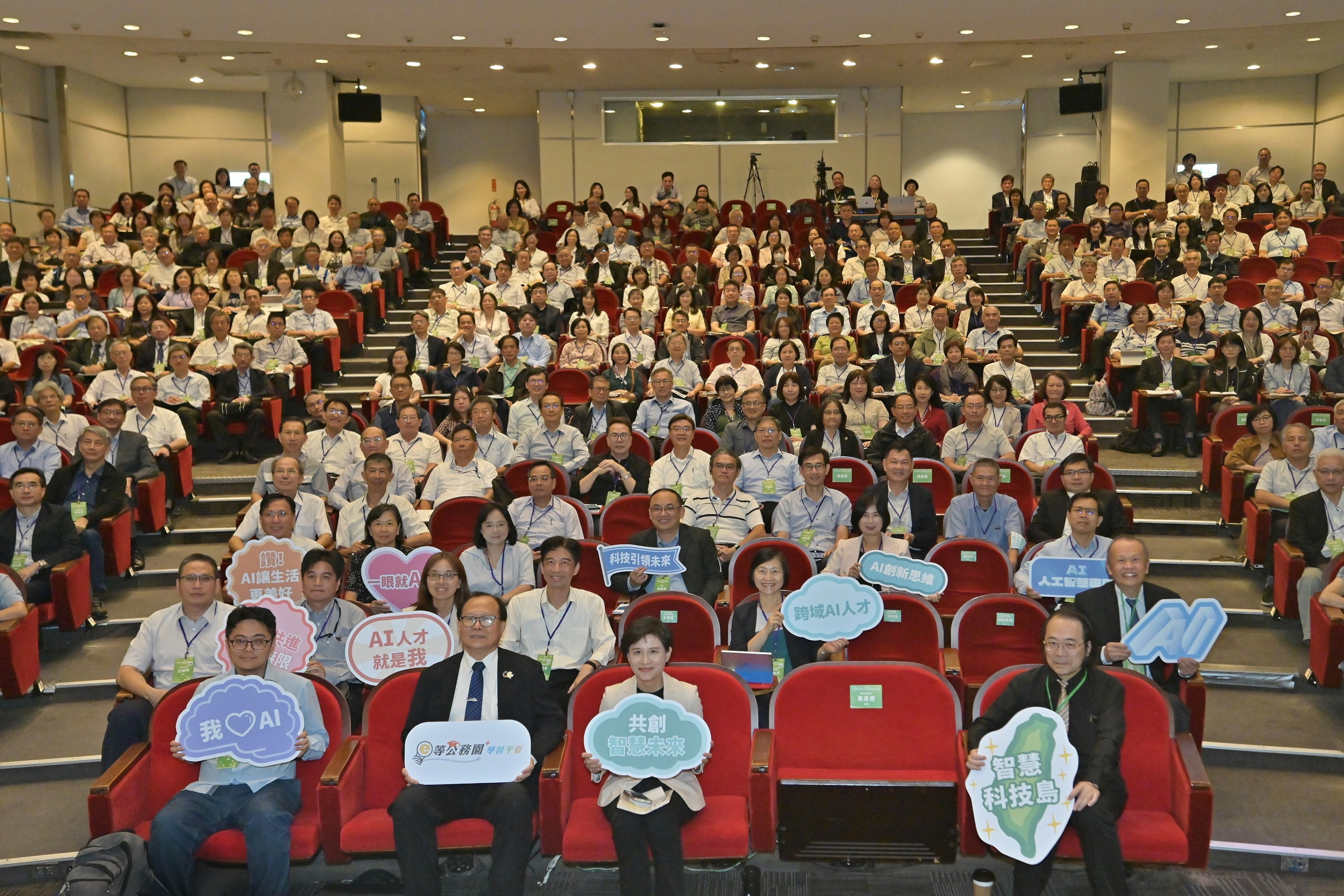 此行,鄭院長抵達後,特別手持「共創智慧未來」手板,和今日參與共識營的三級機關副首長及二級機關司處長等學員一同在座位上合影留念。致詞結束後,鄭副院長也與學員們一起聆聽國立臺灣大學電機工程學系李宏毅教授針對「AI對國家競爭力的機會與挑戰」主題所發表的專題演講。