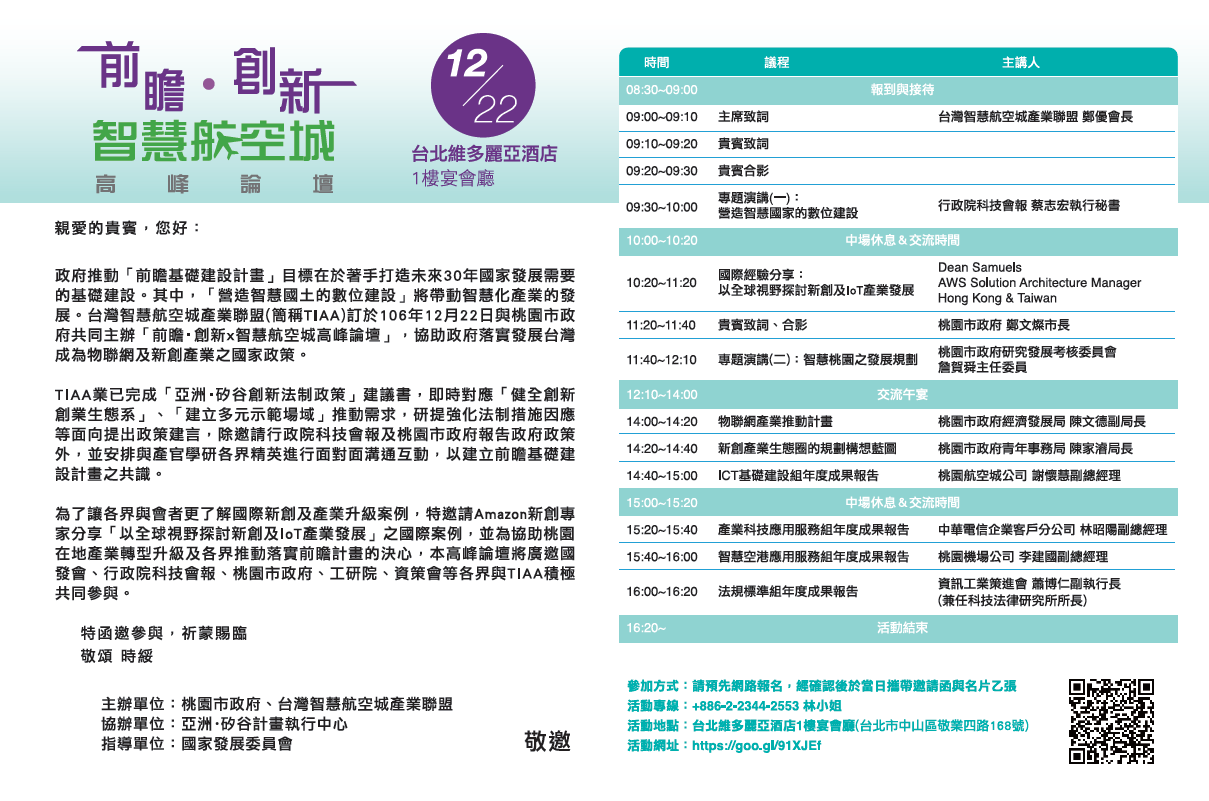 台灣智慧航空城產業聯盟與桃園市政府訂於106年12月22日(五) 9:00~16:20在台北內湖維多利亞酒店共同主辦「前瞻‧創新x智慧航空城高峰論壇」