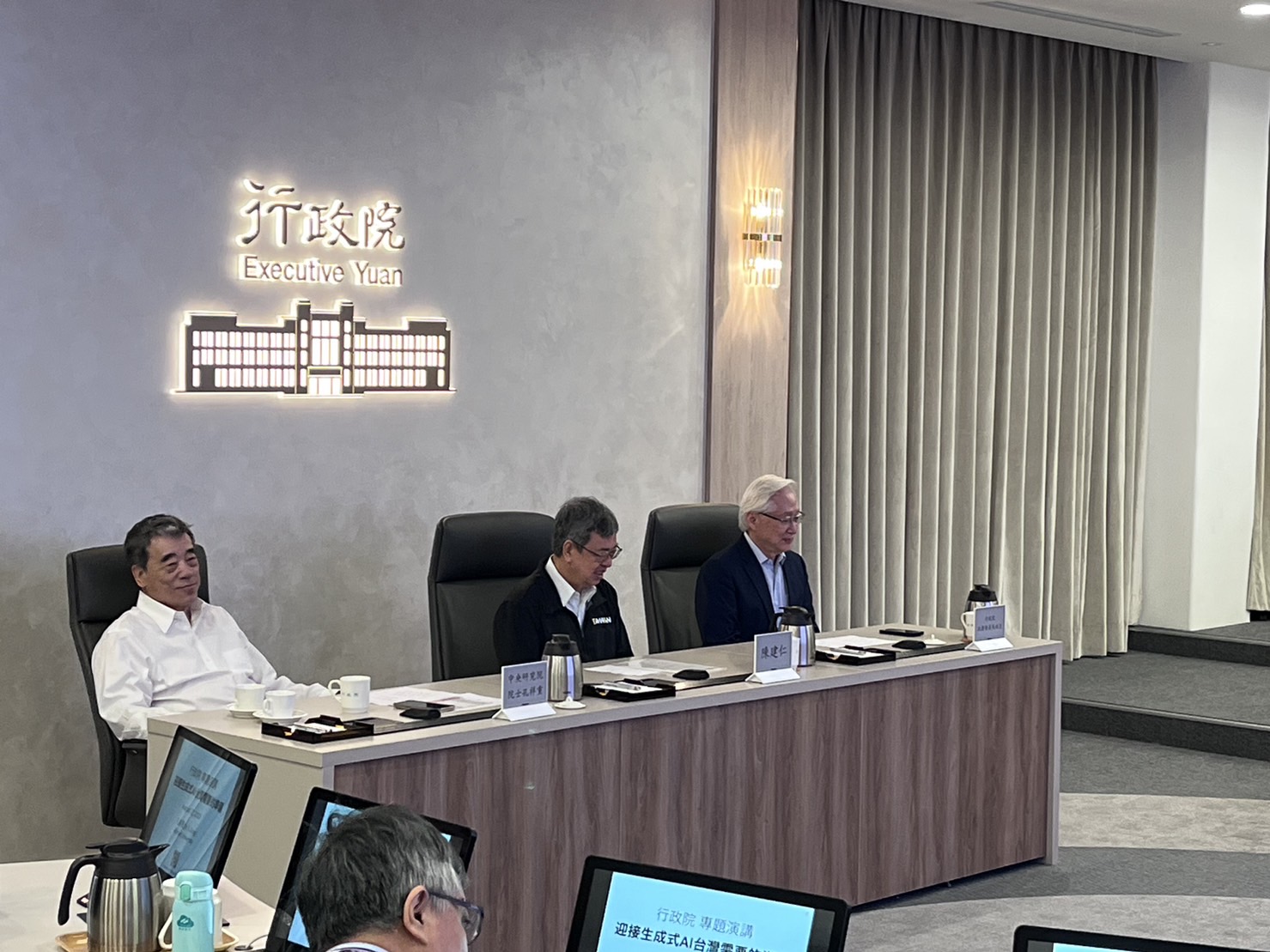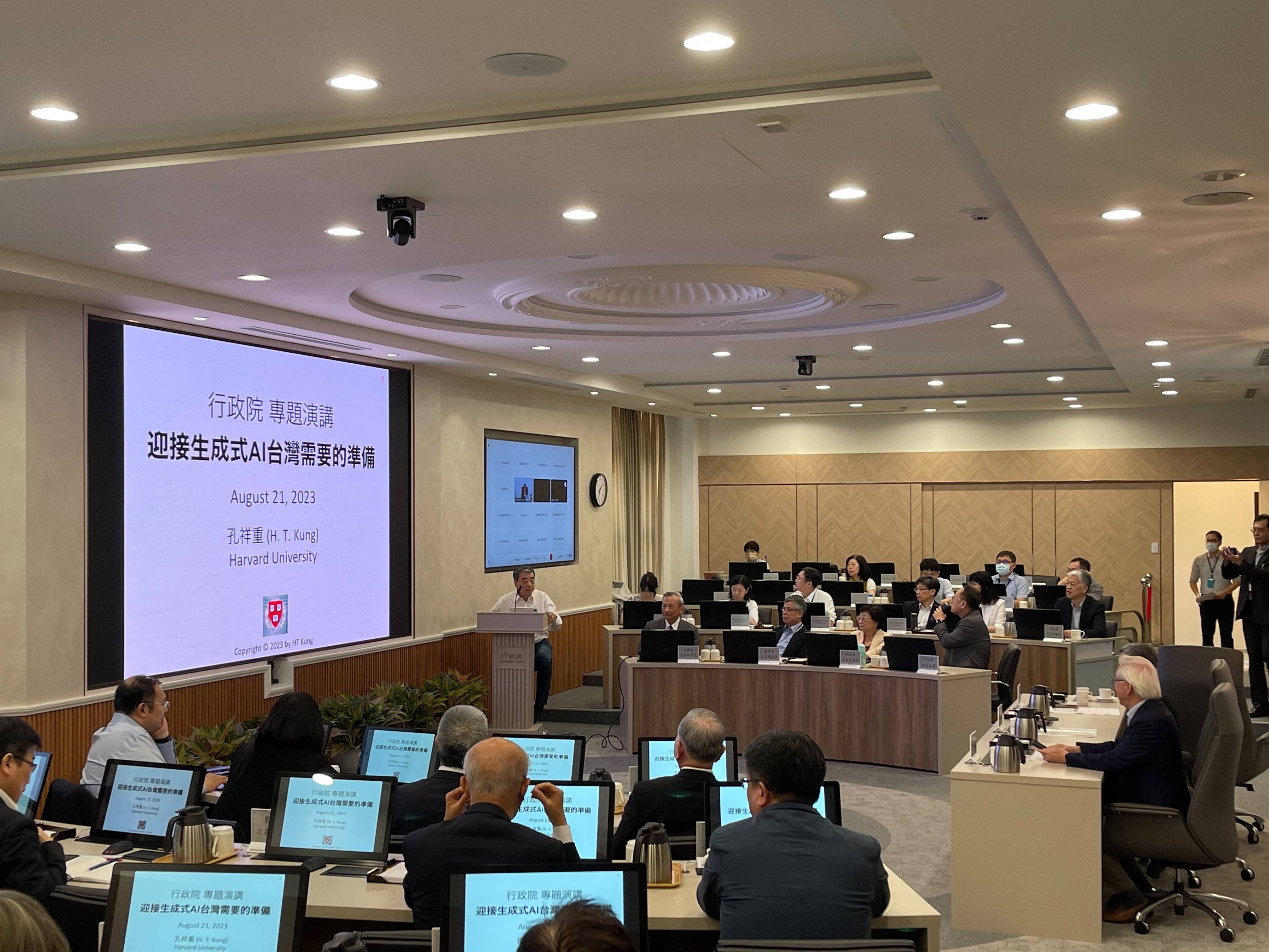 為利各部會首長及同仁瞭解生成式AI趨勢、重要性並協助行政院所屬二級機關思考因應對策,行政院陳建仁院長邀請中央研究院孔祥重院士,以「迎接生成式AI臺灣需要的準備」為題,由國科會科技辦公室於本(112)年8月21日以實體與線上同步進行的方式辦理專題演講,並邀集臺灣金控沈榮津董事長、行政院處室及相關部會(如數位部、經濟部、國發會等)計27名正副首長,於行政院聆聽演講。