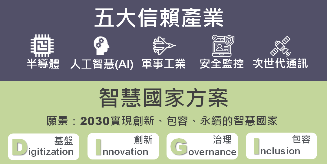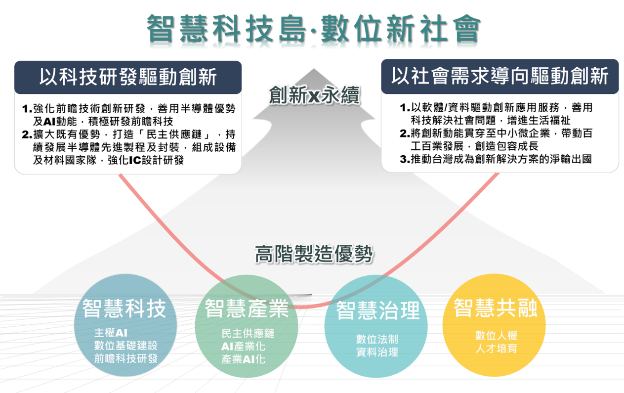 在「以科技研發驅動創新」方面,聚焦於強化前瞻科技與創新研發實力,涵蓋半導體先進製程、IC設計、材料設備自主化、主權AI、量子科技、超級算力平台、衛星通訊等關鍵領域,以此奠定國家科技自主能力,並推動科技產業的民主供應鏈。與之對應,「以社會需求導向驅動創新」則是強調運用軟體與資料技術驅動創新應用,廣泛導入於教育、醫療、交通、災防、氣候調適等民生場域,提升公共服務的智慧化與韌性。此外,開發符合各種產業特質與需求的數位工具,加速推動中小企業及傳統產業的數位轉型,為百工百業催生創新解方,促使臺灣成為數位創新方案的輸出國,強化臺灣科技的國際能見度與競爭力。