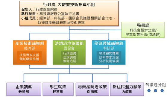 為加速推動政府機關巨量資料分析研究,行政院成立「大數據技術指導小組」,由副院長擔任召集人,科技會報辦公室主責,國發會、經濟部與科技部擔任小組成員,分別就法規環境協調、產業技術輔導及學研領域輔導等面向協助推動政府巨量資料分析。