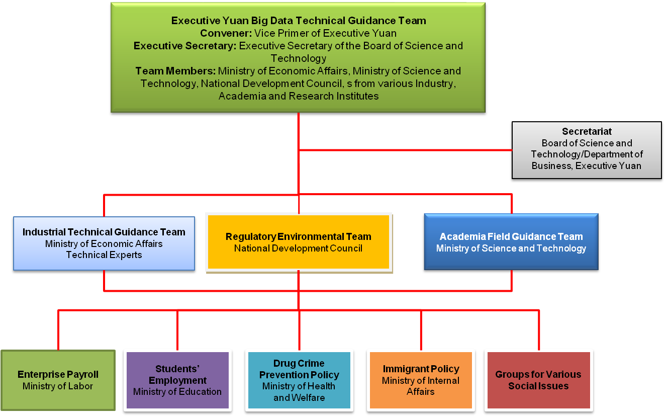 In order to accelerate the applications of big data analysis, the Executive Yuan has set up the “big data technical guidance team”, with the vice primer of the Executive Yuan as the convener, board of Science and Technology in charge. The team members comprise the National Development Council, the Ministry of Economic Affairs and the Ministry of Science and Technology. They assist in the promotion of the government’s big data analysis in the aspects of regulatory environment, industrial technical guidance and academia field guidance relatively.