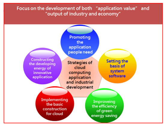At the time when global cloud computing technology and the development of its application and service were rising successively, the Executive Yuan passed “Cloud Computing Industrial Development Program” on April 29th, 2010 in order to extend the advantage of hardware manufacturing from our existing Information and Communication Industry and to obtain the early opportunity of global cloud computing market.